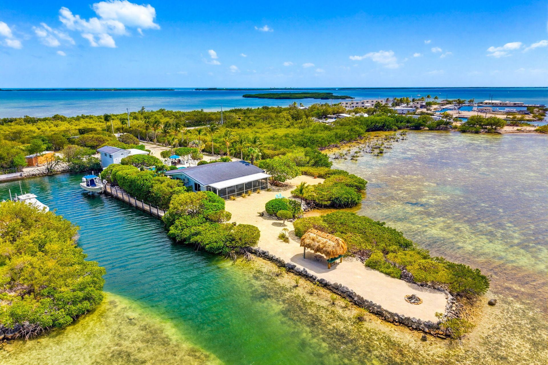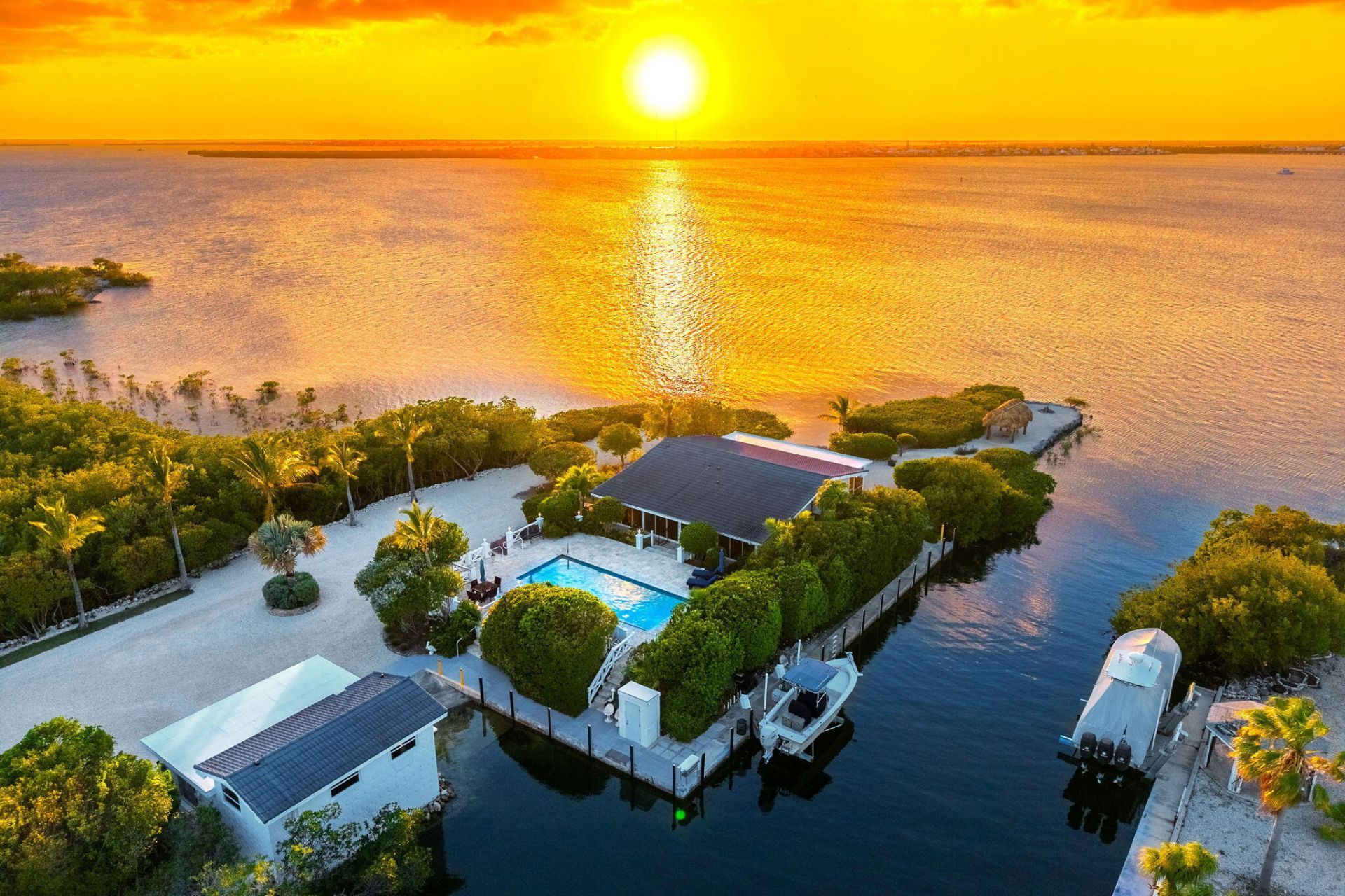 If you've been dreaming of the kind of place where the sunsets stop you in your tracks...this is it. Tucked away on a quiet road in Big Pine Key, this 2 Bedroom 2 Bath plus 1 Bedroom 1 Bath Guest Cottage one-of-a-kind point property delivers something incredibly rare in the Florida Keys, open water views and protected dockage, all wrapped into a private tropical setting on over an acre and a half. Start your mornings launching a paddle board from your sandy beach. Spend your afternoons out o...If you've been dreaming of the kind of place where the sunsets stop you in your tracks...this is it. Tucked away on a quiet road in Big Pine Key, this 2 Bedroom 2 Bath plus 1 Bedroom 1 Bath Guest Cottage one-of-a-kind point property delivers something incredibly rare in the Florida Keys, open water views and protected dockage, all wrapped into a private tropical setting on over an acre and a half. Start your mornings launching a paddle board from your sandy beach. Spend your afternoons out on the water with immediate ocean access from your concrete dock with 10K lb boat lift and concrete ramp or lounging by your heated and chilled pool. And in the evenings? Head to the tiki hut or firepit and watch the sky light up in color as the sun melts into the water. Inside the main home the vibe is pure mid-century coastal charm with highly polished terrazzo floors, wood-style plank ceiling and water views from every room through large impact picture windows. 400 sq. ft front and back screened porches enjoy open water or pool views. The detached Guest Cottage sits atop the 2-Car Garage with additional storage. The pool sits right in the middle of it all, heated, chilled and surrounded by colorful landscaping creating a true resort-style feel. The gated entryway enjoys a scenic drive past towering palms and tropical gardens leading you to the Guest Cottage and ending at Main Home. Additional highlights include RV parking with electric service, full irrigation system with separate water meter, and additional storage.